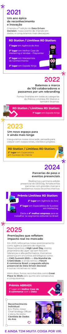 Com uma década mais um ano de vida, a Layer Up carrega uma linha do tempo recheada de conquistas, aprendizados e resultados. Foram muitos os desafios ao longo dessa estrada, mas também muitos prêmios e marcos que mostram como a agência evoluiu junto do mercado. Dá só uma olhada:
